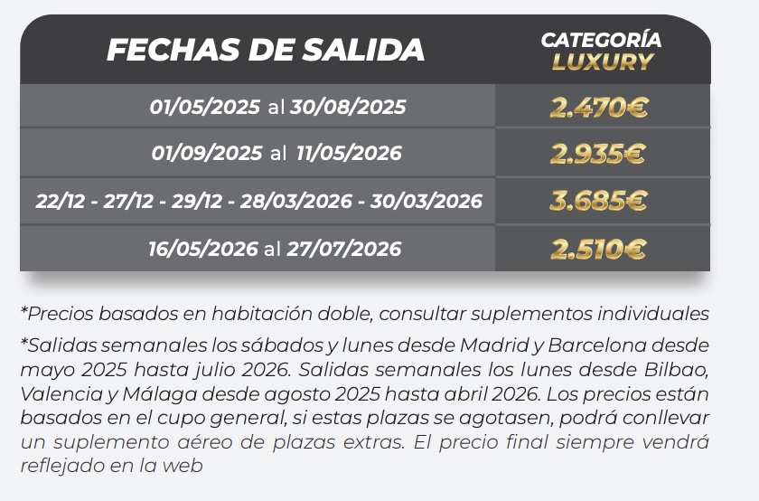 Salidas semanales desde Madrid, Barcelona, Bilbao, Valencia y Málaga.