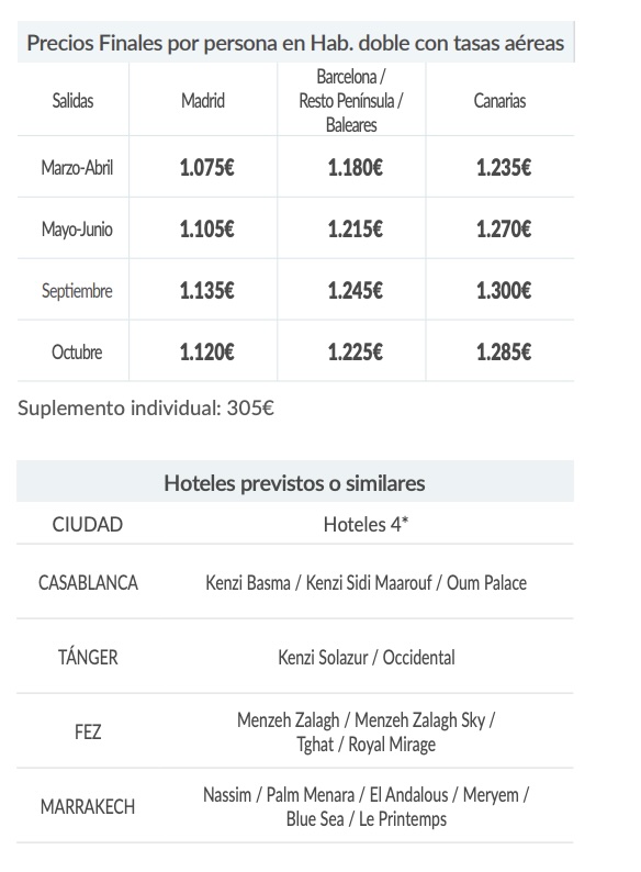 - La entrada a los siguientes lugares: Fez: medersa, Marrakech: Palacio Bahia. Seguro de viaje Mapfre Asistencia.