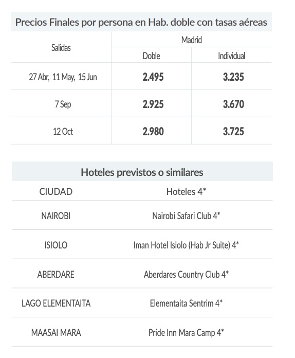Régimen de Pensión Completa Transporte en 4x4 durante el safari con ventanilla garantizada (ocupación máxima 7 personas) y minibús en Nairobi.