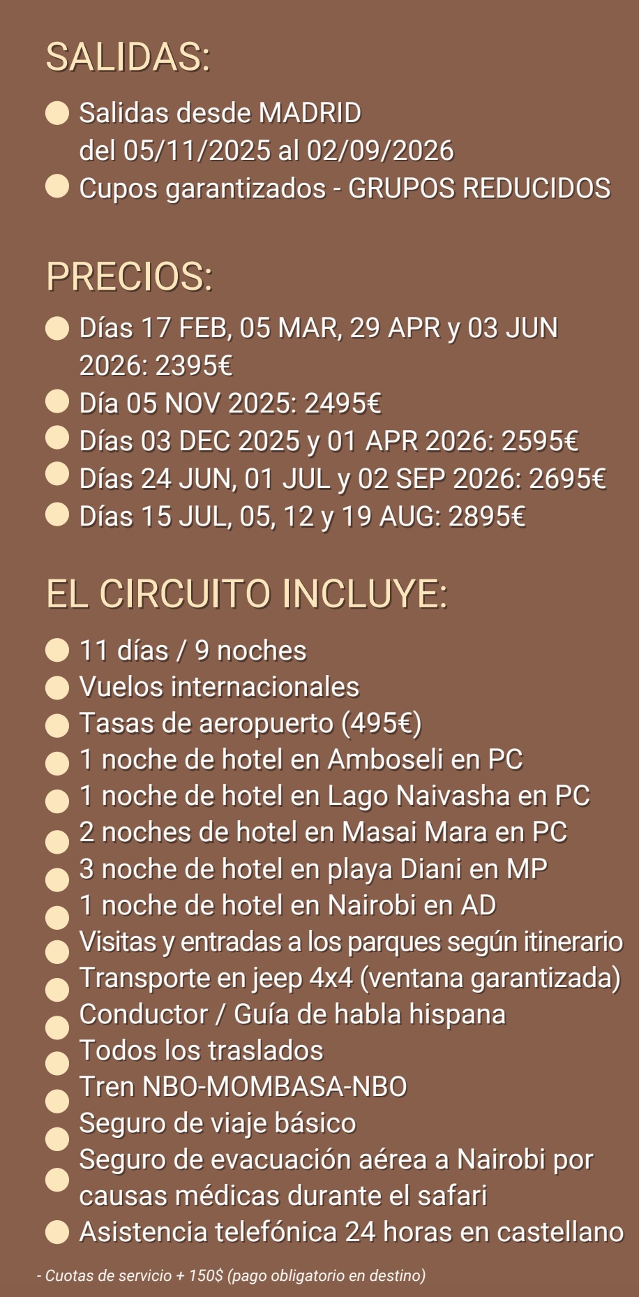 Cuota de servicio 150 $ / persona (pago directo en destino). Este pago es obligatorio realizarlo a la llegada en efectivo y en dólares americanos. Rogamos a los pasajeros que lo tengan preparado para cuando el guía lo solicite.