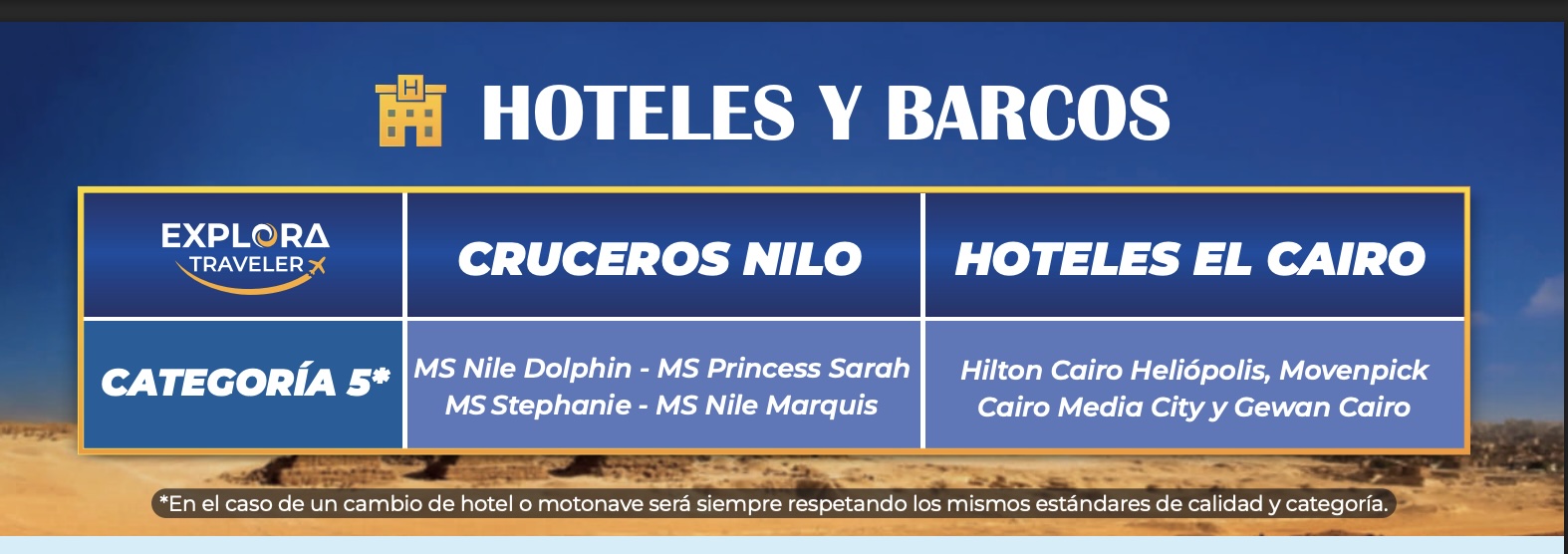 Hoteles y barcos previstos según categoría o similares.