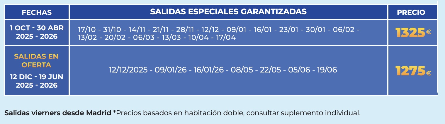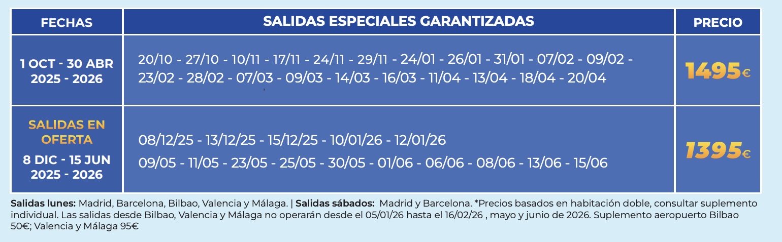 Los precios publicados son finales con tasas y seguro básico incluido en clase turista hasta finalizar cupo (sujeto a cambio hasta 21 días antes de la salida por cambio del precio del combustible y cambio de €/$).