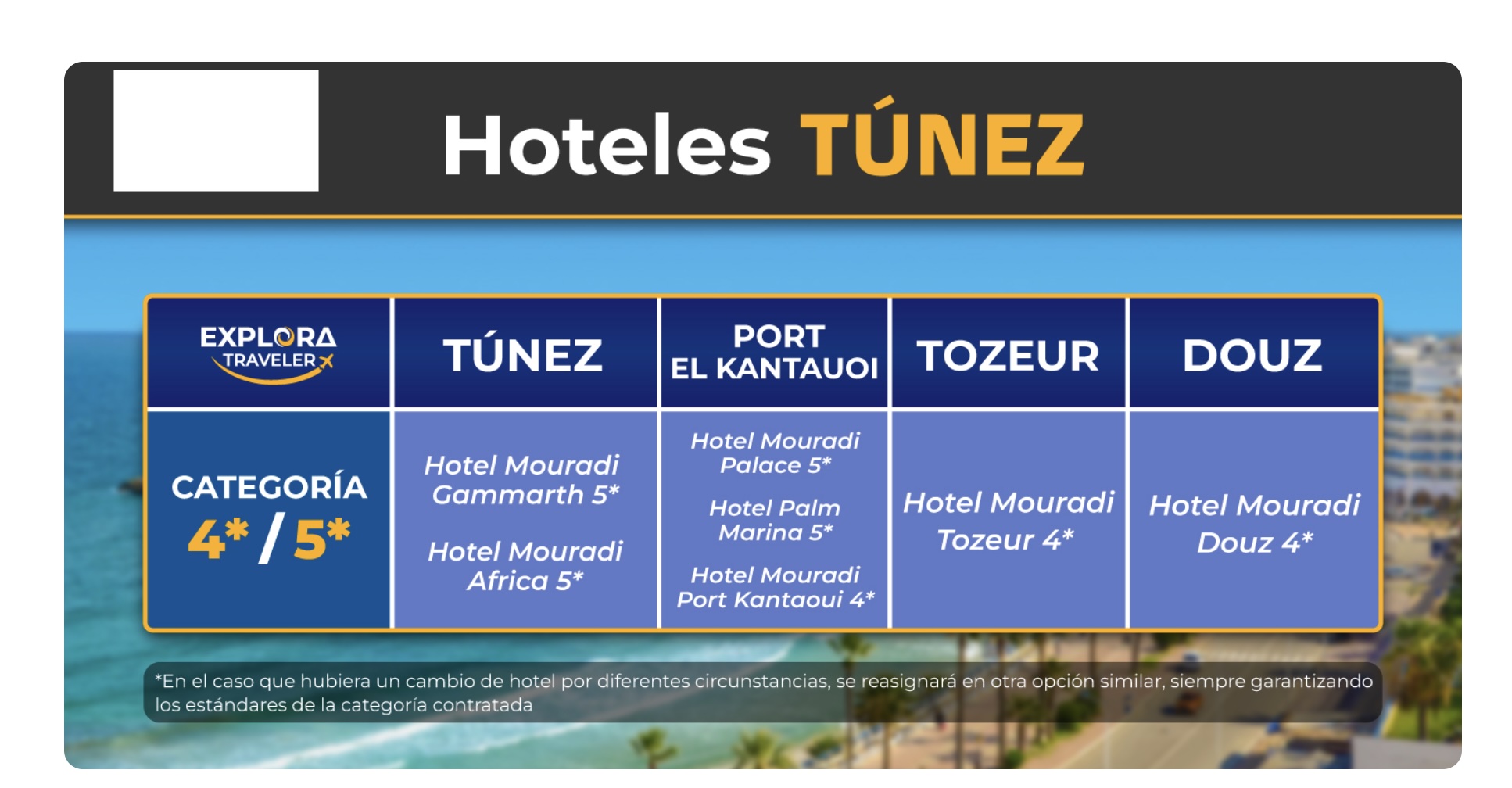 - En caso de llegada a Túnez en vuelos no procedentes de España, se aplicará un suplemento por traslado privado al confirmar la reserva.