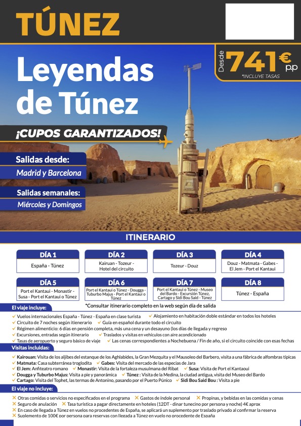 - Suplemento de 100€ por persona para reservas con llegada a Túnez en vuelo no procedente de España.