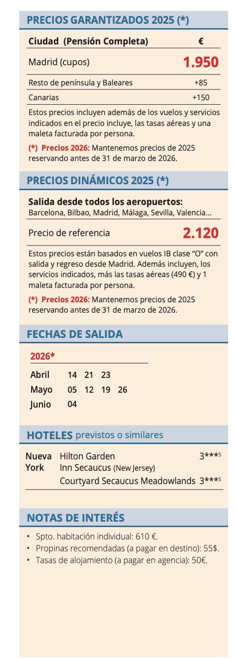 Viaje a Nueva York especial para mayores Seniors , con visitas incluídas y en pensión completa con salida desde Madrid año 2026