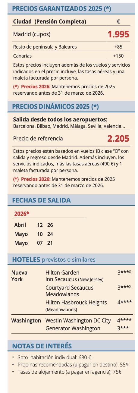 Viaje en grupo senior visitando Nueva York y Washington , pensión completa con guía salida desde Madrid 2026