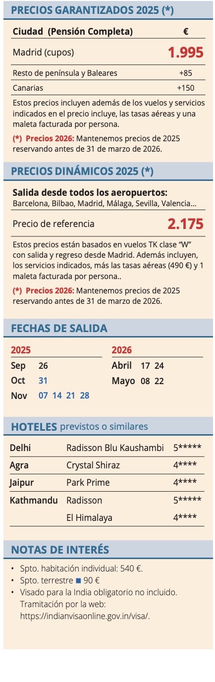 • Visitas incluidas según itinerario: - En Delhi: Panorámica de Nueva Delhi: Puerta de la India, Rashtrapati Bhawan, El Qutub Minar, Templo Gurdwara Bangla Sahib. Visita panorámica de Vieja Delhi, Templo de Loto, Mezquita Jama Masjid, Raj Gatt. - En Agra: Excursión a Agra y Fuerte Rojo Taj Majal y Mausoleo de Etimad-Ud-Daulah (pequeño Taj Mahal). Excursión a Fatehpur Sikri, Abhaneri.. - En Jaipur: Panorámica de a Jaipur: Palacio de Maharaja y Palacio de Vientos (por fuera) y Fuerte Amber. Pueblo de Shahpura. - En Katmandú: Panorámica de Katmandú. Visita de Patan.