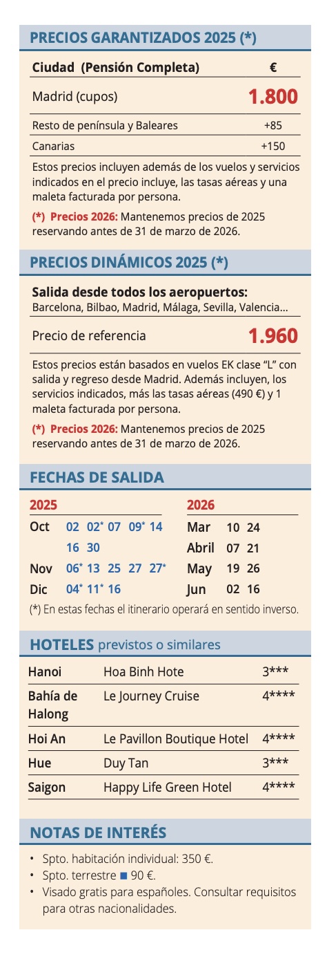 • Vuelo en línea regular: ciudad de origen-Hanoi (vía ciudad intermedia)/ Hanoi - Da Nang/ Hue - Saigon /Saigon-ciudad de origen (vía ciudad intermedia) o viceversa, tasas aéreas incluidas.