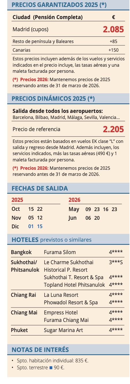 • Vuelo en línea regular: ciudad de origen-Bangkok / Bangkok-islas-Bangkok /Bangkokciudad de origen, tasas aéreas incluidas.