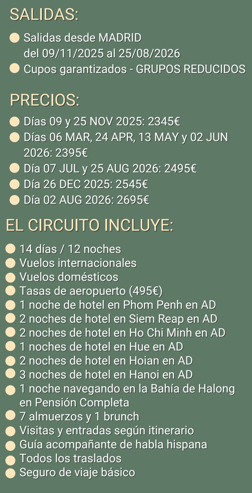 PHNOM PENH - SIEM REAP - HO CHI MINH - DELTA DEL MEKONG - HUE - HOIAN - HANOI - BAHIA DE HALONG - HANOI
