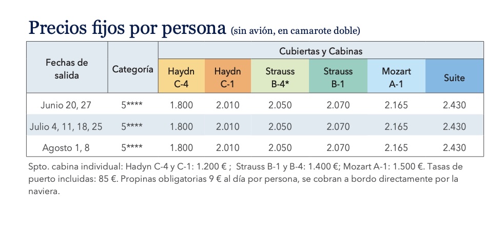 • Acomodación en el exclusivo Amadeus Imperial en camarote exterior de su elección, con ventanas panorámicas o balcón francés.