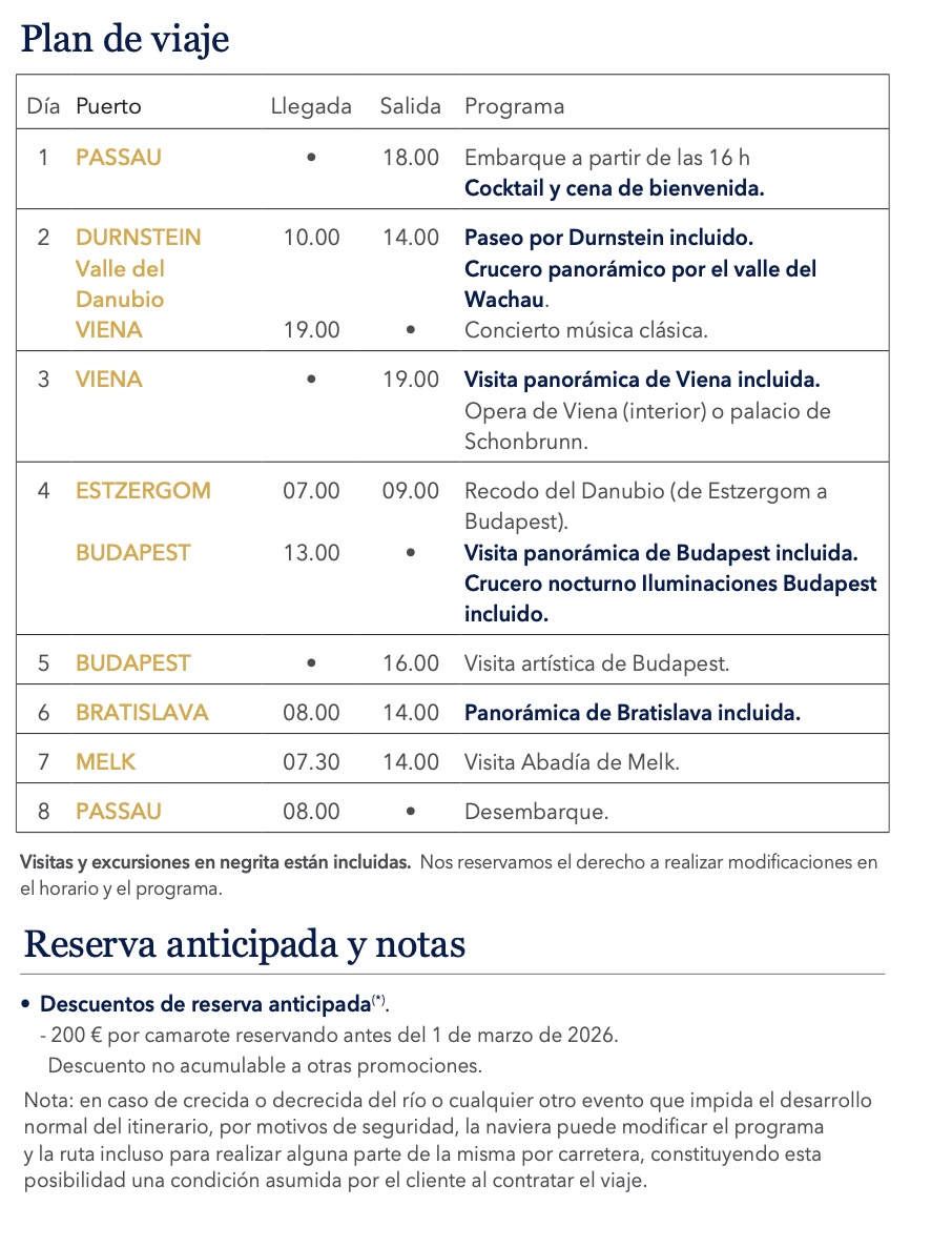 • Visita de Durnstein. Crucero panorámico por el valle del Wachau. Panorámica con guía local de Viena. Panorámica con guía local de Budapest. Crucero nocturno Iluminaciones Budapest. Panorámica con guía local de Bratislava (a pie).