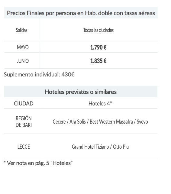 - Guías locales para las visitas de Bari, Matera y Lecce.