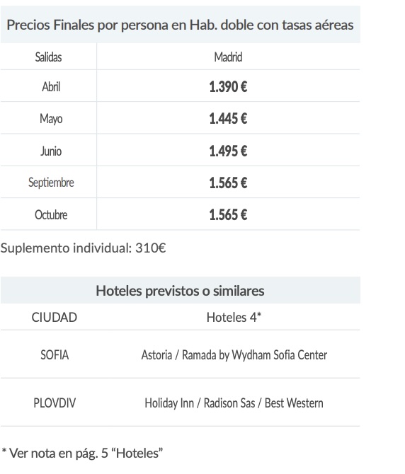Llegada y visita panorámica de la capital búlgara, paseo por su casco histórico para conocer lo más destacado del amplio patrimonio cultural de la capital búlgara: veremos la catedral ortodoxa Alexander Nevsky (por dentro), la plaza de Sveta Nedelia, la rotonda romana de San Jorge que data del siglo IV y es una de las más antiguas de los Balcanes, las iglesias de San Nicolás, Santa Petka y Santa Sofia, la Universidad Climent Ohridski, la Galería Nacional de Arte (anterior residencia de los zares) o el teatro Ivan Vazov.