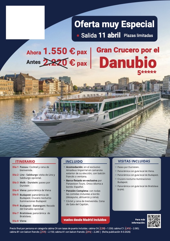 Viajes de última hora , todo organizado con guías, comidas, excursiones y visitas , Crucero por el Danubio , circuitos por Italia , Salidas desde Madrid , vuelos incluídos, últimas plazas