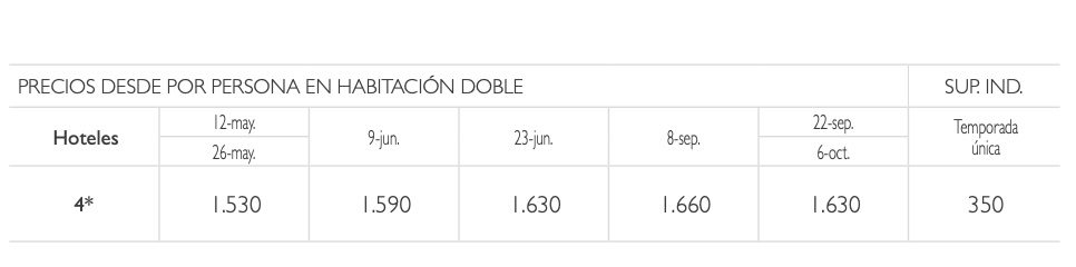 - Alojamiento y desayuno en hoteles previstos o similares categoría 4*, habitaciones dobles con baño o ducha.