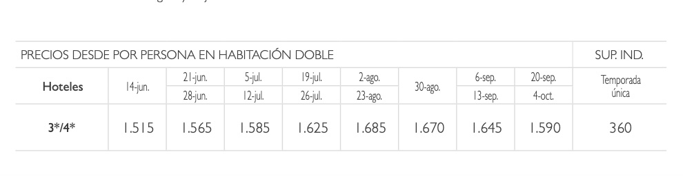 - Alojamiento y desayuno en hoteles previstos o similares categoría 3*/4*, habitaciones dobles con baño/ ducha.